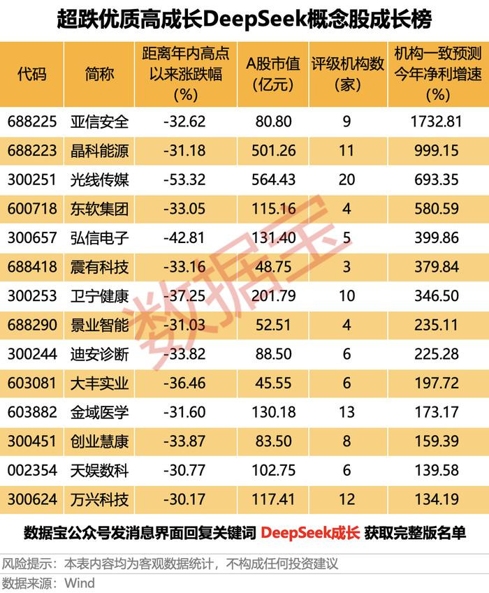 一批超跌高成长概念股引关注。据证券时报·数据宝统计,距年内高点以来跌超30%的DeepSeek概念股中,有25股评级机构数在3家以上且机构一致预测今年净利增速超100%。其中,获得9家机构评级的亚信安全机构一致预测其今年净利增速超过17倍,居首。